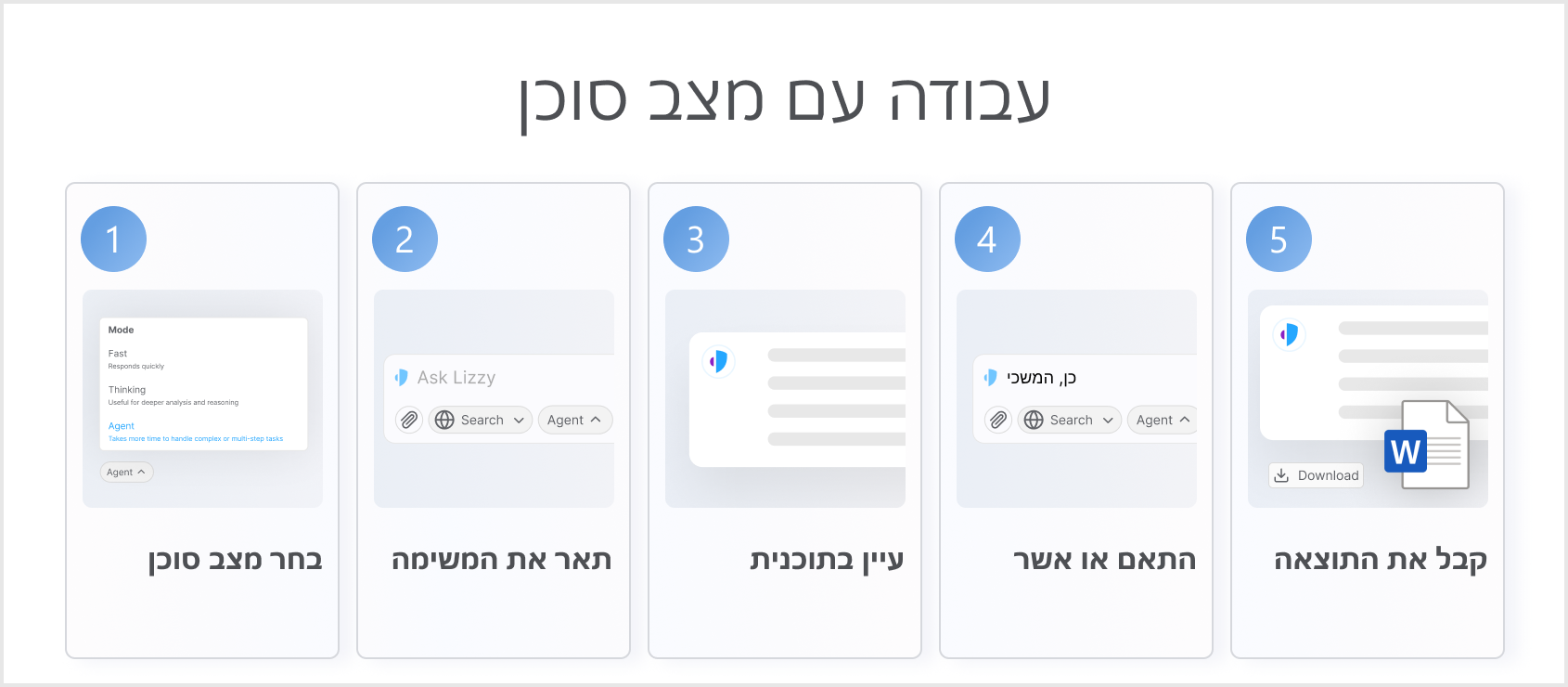מצב סוכן הוא מצב תפעולי חדש בליזי, המיועד למשימות משפטיות מורכבות ורב-שלביות. הוא מפרק עבודה מסובכת לתת-משימות ומבצע אותן ברצף, בעומק ובעקביות. תכונות אלה, ששמות את הביצוע במרכז, הן מה שהופך אותו לחזק במיוחד עבור מסמכים ארוכים, מדריכי סקירת חוזים, ותרחישים שבהם החמצת הוראה אחת משמעותה החמצת העיקר.