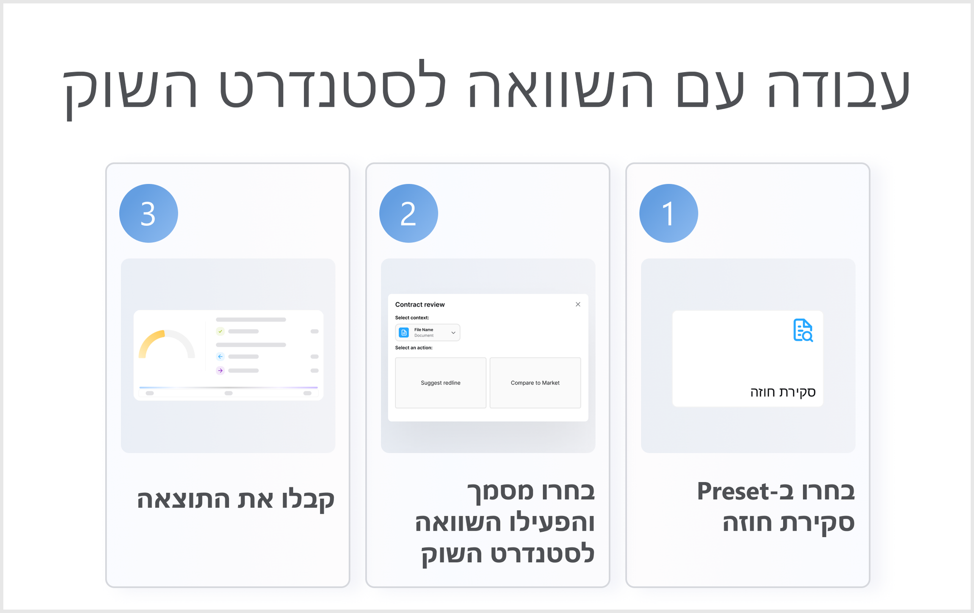 "השוואה לסטנדרט השוק" נבנתה בדיוק כדי לגשר על הפער הזה: לא רק להבין את החוזה, אלא למקם אותו על הספקטרום של השוק, במהירות ובעקביות לאורך כל המסמך.