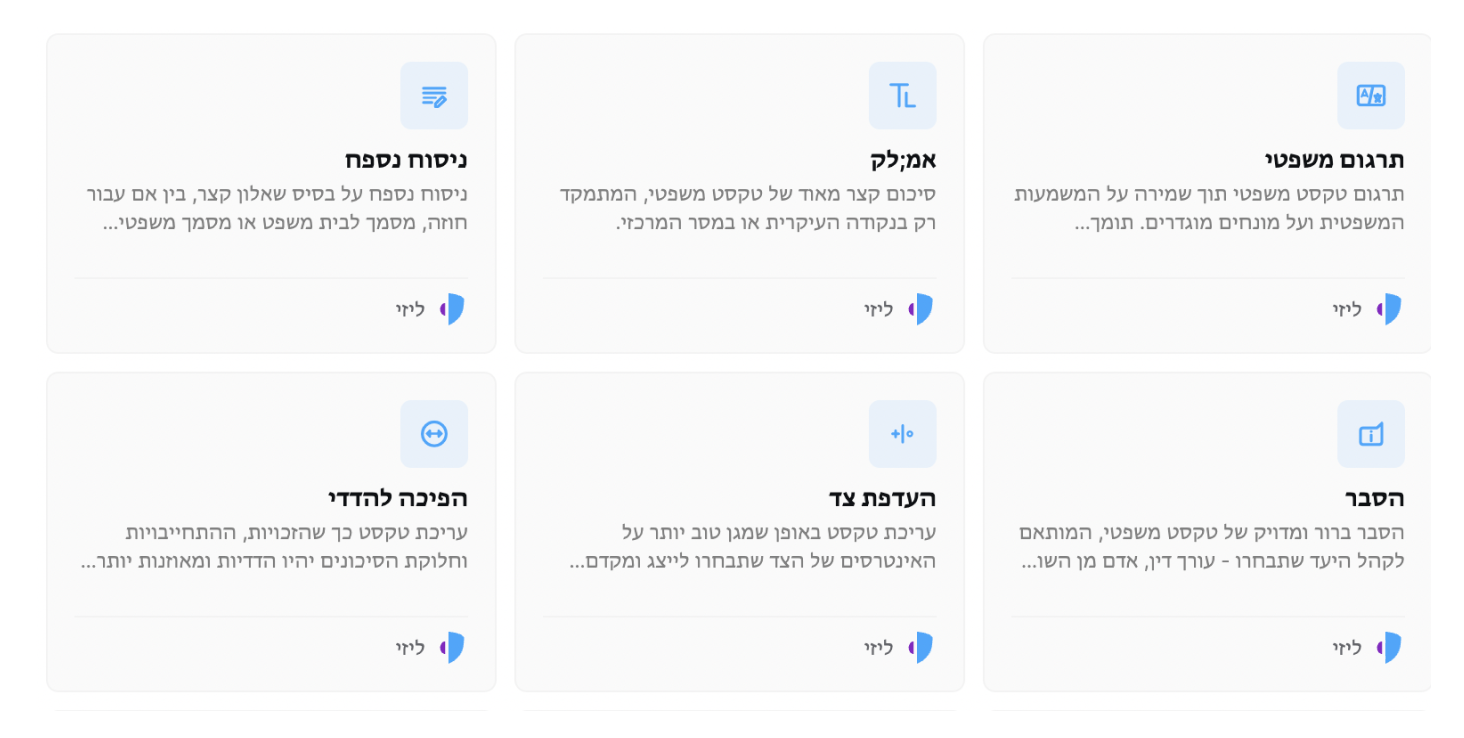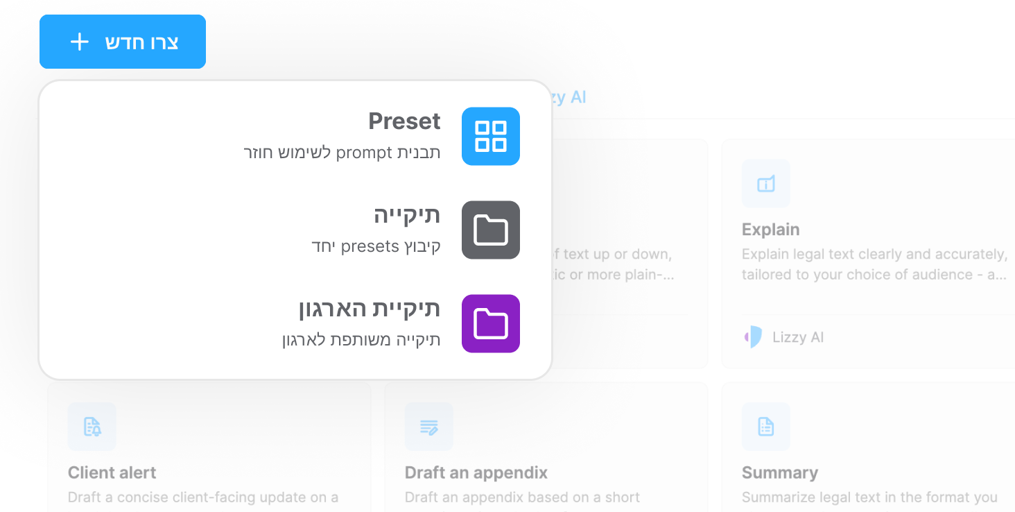 Presets נמצאים בלב האופן שבו העבודה מתבצעת בליזי. הם מאפשרים לכם להפעיל תהליכי עבודה לשימוש חוזר, להפוך משימות חוזרות לאוטומטיות וליצור סטנדרטיזציה באופן שבו מתבצעת עבודה משפטית. עדכון זה מתמקד בשיפור האופן שבו אתם מעיינים ב-Presets, מארגנים אותם ויוצרים אותם.