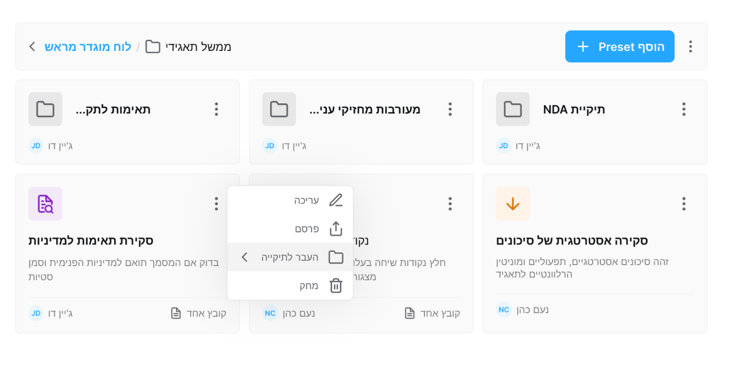 כרטיסי Preset שעוצבו מחדש בליזי, המציגים מידע מובנה ופרטי המחבר פעולות מהירות לניווט מהיר יותר בין תהליכי עבודה.